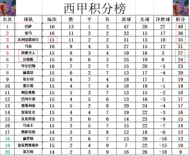 积分榜方面,皇马近5轮真是惨不忍睹,5轮4场丢分,5轮只拿到6分,这期间巴萨则是一直在连胜,如今皇马已经是从领先5分到落后4分。不仅是丢榜首,皇马现在多赛一场只多比利亚雷亚尔1分,届时很可能第2都保不住。西班牙人今天赢球后,超过贝蒂斯3分冲进前5。